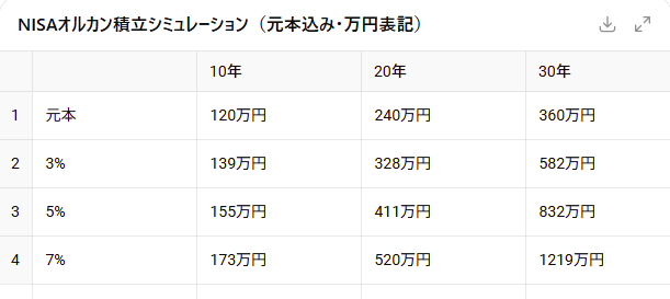 積み立てる時間が長い方が有利✨(このシュミレーションはNISAの積み立て枠でオルカンに投資した場合)